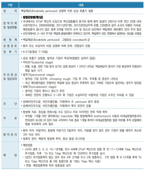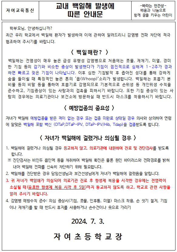 교내 백일해 발생에 따른 안내문