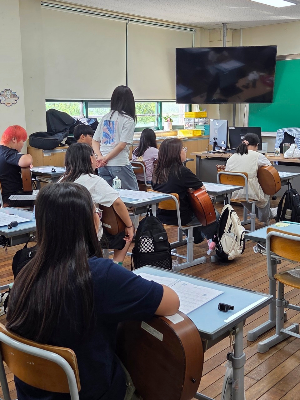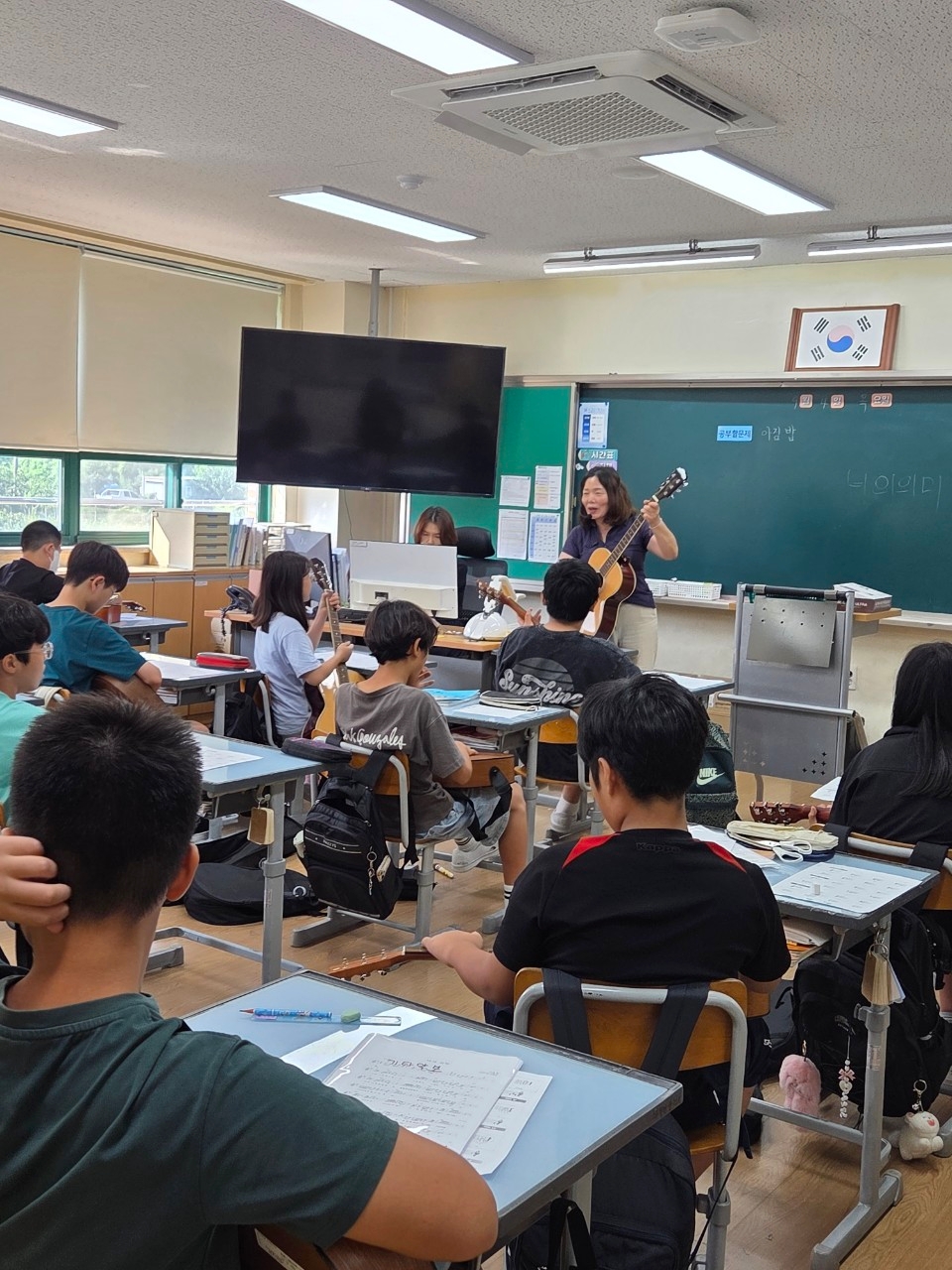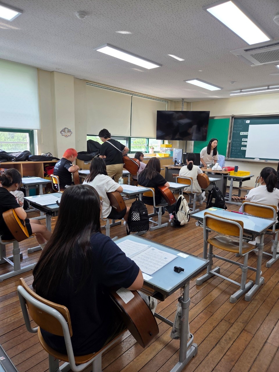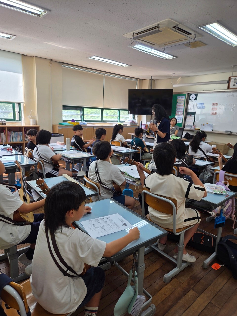 2025. 전교생 1인 1악기 수업을 다음과 같이 운영하고 있습니다. 1. 대상 및 시수 : 전교생, 각 학년 별 주 1회, 연간 총 20시간 실시 2. 장소: 각 학급 교실 3. 학년별 악기와 시간 수업 | 수업 학반 | 시간 | 오카리나 | 1학년, 2-1, 2-2 | 목요일 1,2,3교시 | 우쿨렐레 | 3-1, 4-1 | 목요일 1,2교시 | 우쿨렐레 | 3-2, 4-2 | 목요일 1,2교시 | 기타 | 5-1, 6-1 | 목요일 1,2교시 | 기타 | 5-2, 6-2, 6-3 | 목요일 1,2,3교시 |